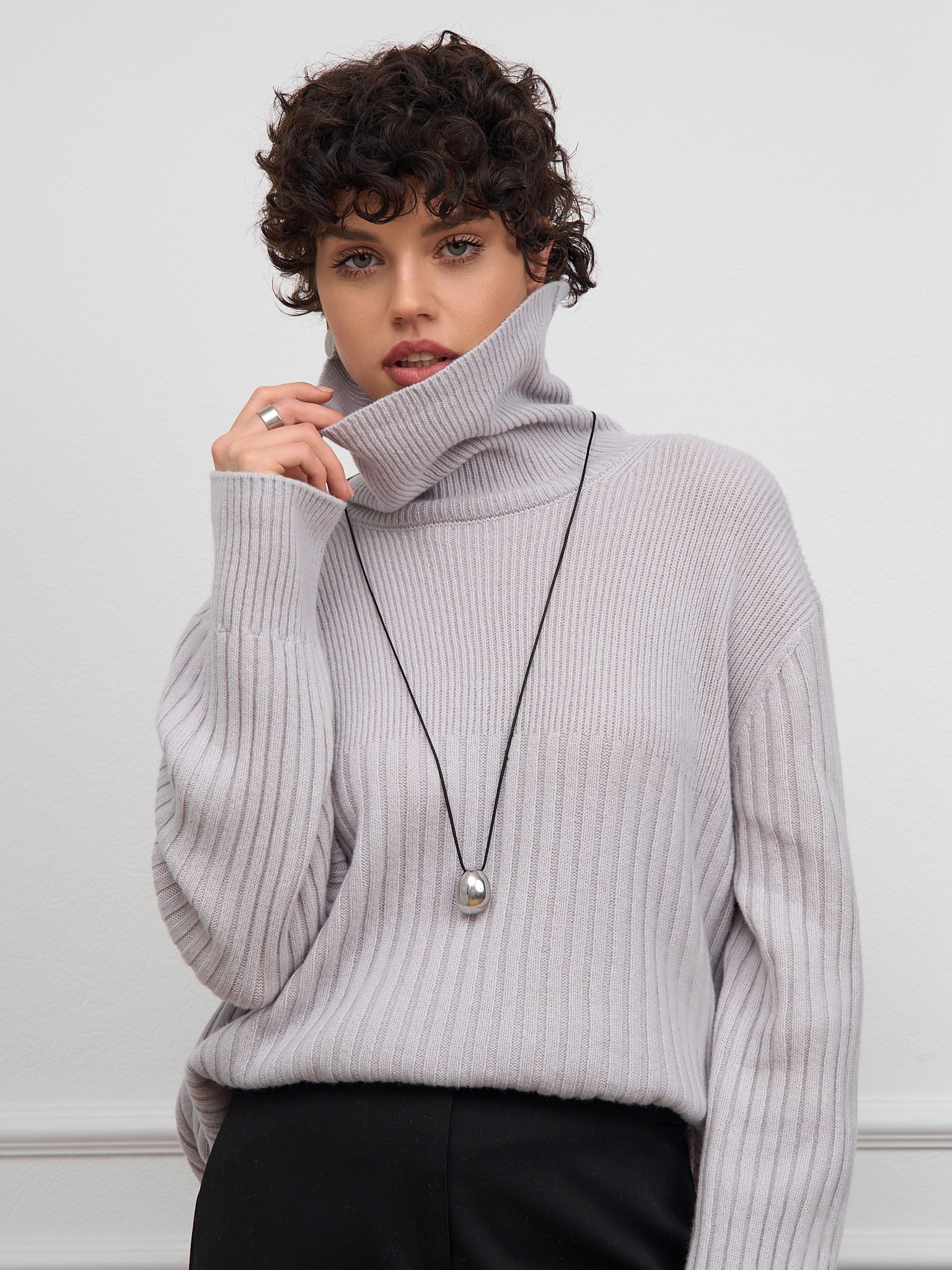 Свитер с высоким воротом-хомут фактурной вязки, с манжетами и поясом в рубчик выполнен из кашемира с мериносом.